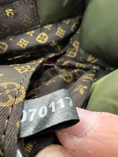 This image shows the interior compartment of a handbag designed to look like a Louis Vuitton 'Pillow' collection piece, specifically echoing the aesthetics of the Monogram Metis or Speedy lines. The physical characteristics include a combination of brown monogram-printed coated canvas or synthetic material alongside a padded, olive green nylon or polyester puffy lining. The monogram pattern visible on the interior flap and pocket area displays the iconic quatrefoils and LV logo in a yellowish-tan hue against a dark chocolate brown background. A small metallic gold-tone rivet or snap is visible, though it lacks the sharp embossing typically found in authentic luxury goods. A black woven fabric tag is prominently featured, displaying the white printed numbers '070117'. In terms of condition, the materials appear relatively new, but the stitching shows slight irregularities and fraying at the edges of the tag. Several significant red flags indicate this is an inauthentic (counterpoint) item: the use of a printed fabric date tag rather than a leather heat-stamp, the blurry quality of the monogram print on the interior fabric, and the font style of the serial numbers, which do not conform to Louis Vuitton’s standard manufacturing codes. The craftsmanship lacks the precision and high-grade leather finishing expected from the brand.