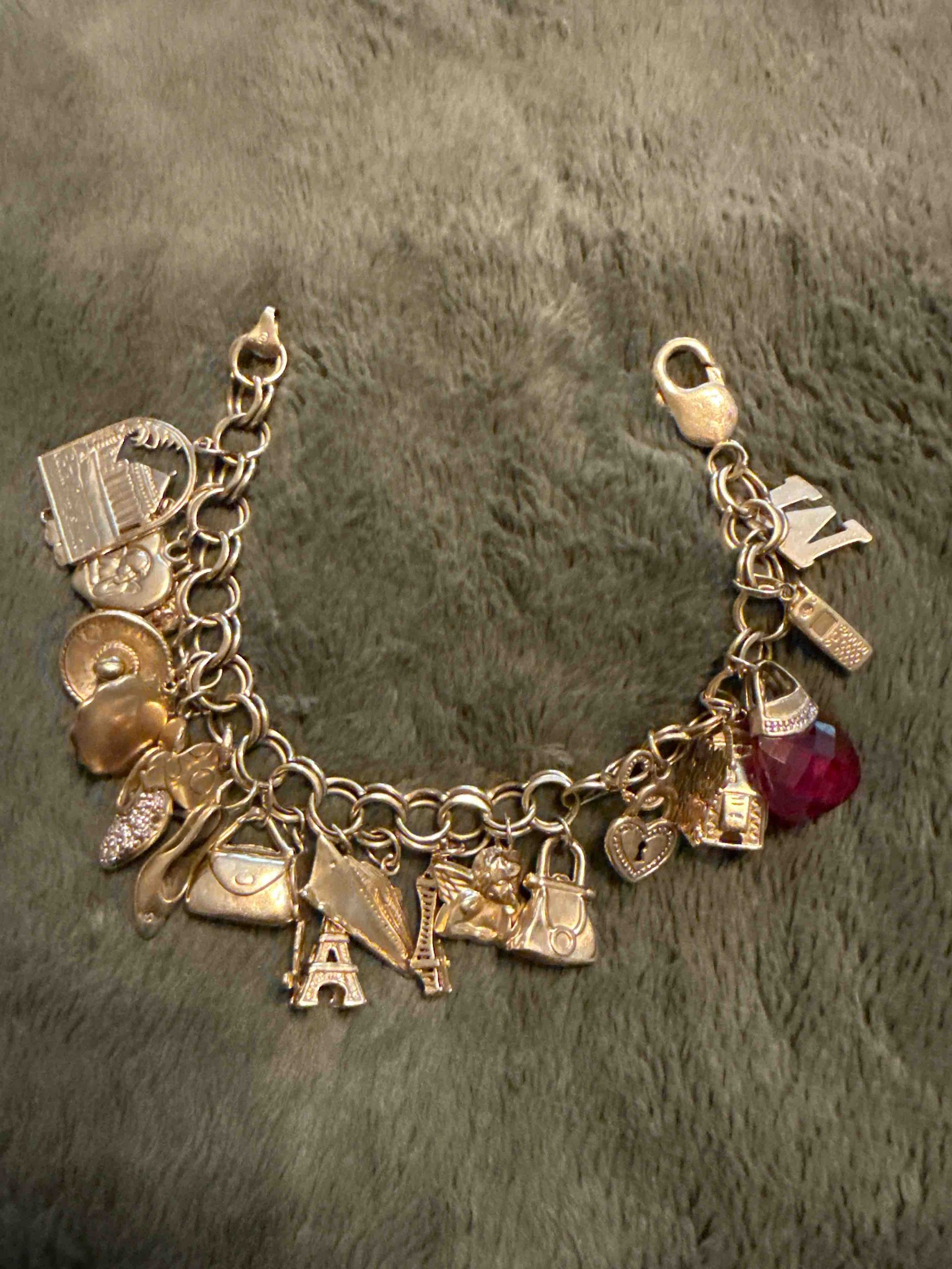 This is a detailed charm bracelet featuring a variety of symbolic pendants attached to a classic rounded link chain. The piece is crafted in a gold-toned metal, likely yellow gold or gold-plated silver, and features approximately thirteen distinct charms hung along its length. These charms include a diverse range of motifs such as a high-heeled shoe accented with pave-set stones, a miniature handbag, the Eiffel Tower, several other architectural structures, a heart-shaped lock, an 'M' initial, and a large faceted translucent red gemstone focal point. The construction utilizes a sturdy lobster-claw clasp for secure fastening. Physically, the metal shows a polished finish with significant high-points and recessed detailing on the individual charms, creating a textured and dynamic aesthetic. Based on the style of the charms—particularly the specific handset crystal work and the polished gold-tone finish—this piece likely dates from the late 20th to early 21st century, fitting a 'souvenir' or 'fashionista' theme. The condition appears well-maintained, with minor visible surface scratching consistent with moderate wear and a light patina in the crevices of the more intricate charms like the Eiffel Tower and the small buildings. The variety of sizes and the density of the charms indicate a piece designed for personal expression and collection over time.
