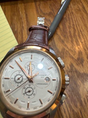 This is a Tissot Couturier Quartz Chronograph wristwatch, likely from the modern era (post-2010). The timepiece features a multi-piece 316L stainless steel case with a prominent rose gold-tone PVD coated fixed bezel. The dial is a silver-white color with a concentric circular texture on the outer ring and a smooth center. It features three sub-dials at the 2, 6, and 10 o'clock positions, a date window at 4 o'clock, and rose gold-tone faceted hour markers and hands. The 'Tissot 1853' logo is clearly printed at the 3 o'clock position. The watch is fitted with a brown leather strap that has an embossed alligator or crocodile pattern and a stainless steel butterfly deployment clasp. In terms of condition, the piece shows moderate signs of wear including fine surface scratches on the polished rose gold bezel and several noticeable scratches on the sapphire crystal, particularly near the center and the 3 o'clock mark. The leather strap shows light creasing from use. The chronograph pushers and crown appear to be original and in good physical condition. The craftsmanship reflects Tissot's entry-level luxury positioning, utilizing a reliable Swiss quartz movement housed in a robust, water-resistant case.