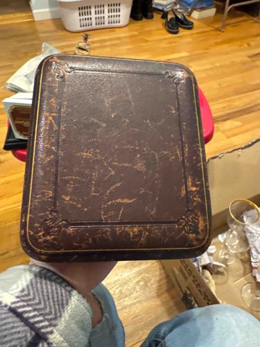This is a rectangular vintage presentation case or storage box, likely dating from the early to mid-20th century. The exterior is wrapped in a dark burgundy or deep brown grained leather or high-quality leatherette material. A defining feature is the gold-toned or gilded decorative border, which consists of a single linear fillet frame with elegant scrollwork or fleur-de-lis flourishes at each of the four rounded corners. The surface shows significant signs of age and use, characterized by extensive scuffing, loss of the top pigment layer, and surface abrasions that reveal a lighter tan or fibrous material underneath. These wear patterns, particularly concentrated on the lid, suggest heavy handling over time. The rounded edges indicate a molded shell construction common for premium vanity or jewelry items of the era. While no specific maker’s mark is visible from this angle, the quality of the gold tooling and the specific grain of the leather suggest a well-made mid-century personal accessory. The patina is consistent with long-term storage and natural aging of organic materials. The structural integrity appears sound despite the cosmetic surface distress.