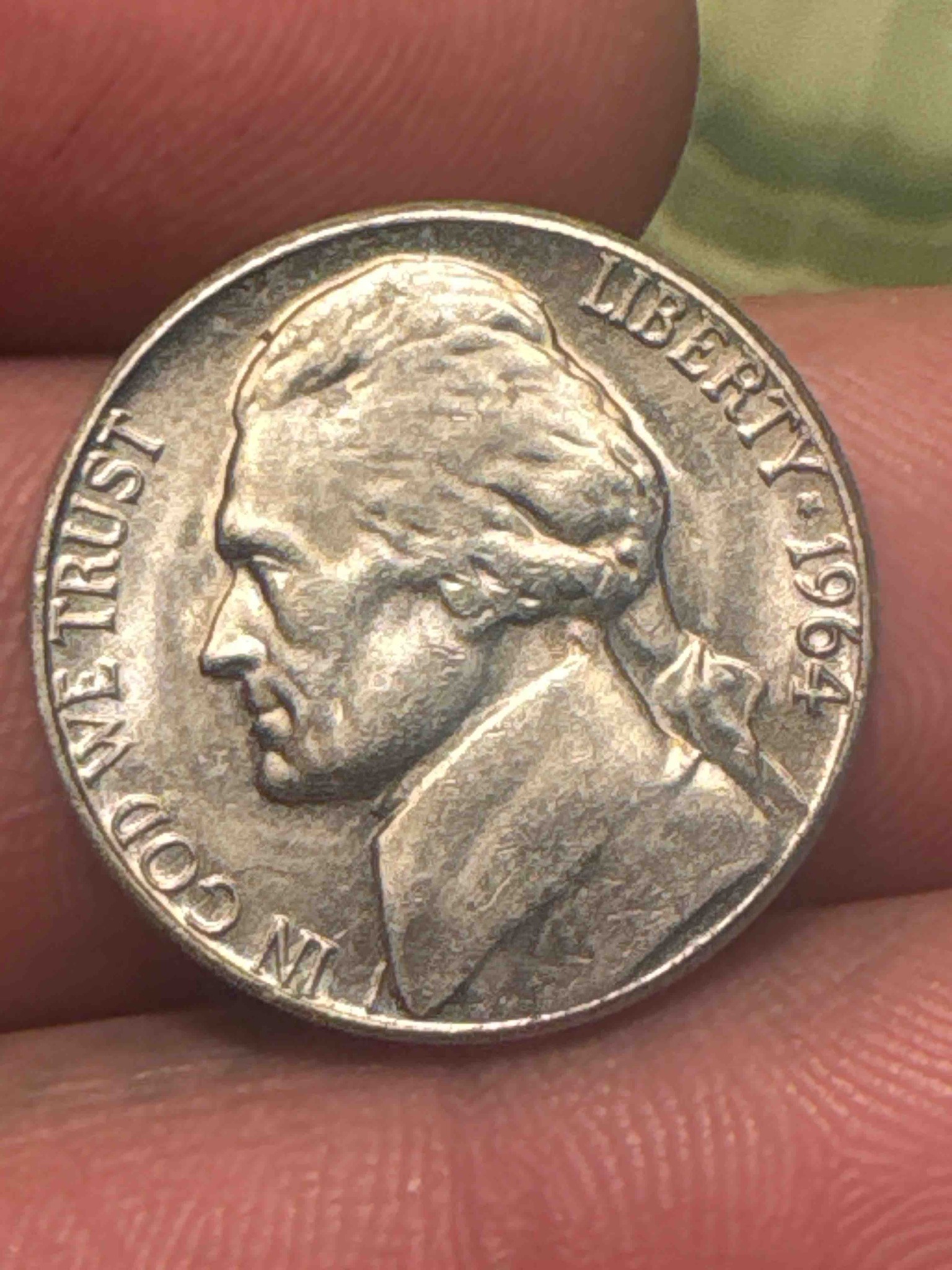This is a United States Jefferson Nickel dated 1964. The obverse side features the profile of Thomas Jefferson, based on a design by Felix Schlag. The coin is composed of an alloy consisting of 75% copper and 25% nickel. It has a standard diameter of 21.21 mm and a smooth (plain) edge. The left-hand inscription reads 'IN GOD WE TRUST,' while the right-hand inscription reads 'LIBERTY' followed by the date '1964.' The condition of this specific specimen indicates it has spent significant time in circulation. There is noticeable wear on the high points of Jefferson's hair, cheekbone, and collar, which has flattened the original fine details of the strike. The surfaces show numerous small contact marks, scratches, and a dull greyish-nickel patina, which is typical for circulated base-metal coinage. There is a lack of original mint luster. The rim appears mostly intact but shows minor softening. No mint mark is visible on the obverse (prior to 1968, mint marks were located on the reverse near Monticello), suggesting it was likely minted in Philadelphia. Considering 1964 had the highest mintage in the series' history with over 1 billion coins produced, this item is a common numismatic piece valued primarily for its historical context rather than rarity.
