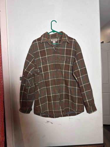 This is a long-sleeved, button-down flannel work shirt from Duluth Trading Company, featuring a classic multi-colored plaid pattern. The color palette is dominated by olive green and various shades of brown, accented by thin white and red intersecting lines. In terms of construction, the shirt features a standard pointed collar, dual chest pockets with buttoned flaps, and adjustable button cuffs. The material appears to be a heavy-duty brushed cotton or flannel, typical of the brand's 'hardworking' apparel line. A visible woven manufacturer's label is sewn inside the collar area, which includes the brand logo and size information. The garment exhibits a relaxed or 'tradesman' fit, designed for mobility and utility. Regarding condition, the shirt shows signs of pre-owned wear, including slight pilling on the fabric surface and minor softening of the collar structure, but it lacks any visible tears, significant stains, or missing buttons. This style is characteristic of modern outdoor workwear from the late 20th to early 21st century. The quality is indicated by the reinforced stitching and the substantial weight of the textile, which is a hallmark of Duluth's craftsmanship meant to withstand rugged use.