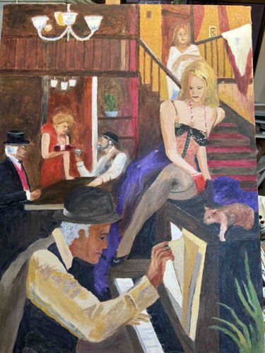 This is an original hand-painted work of art executed in an impasto style on what appears to be a vertical stretched canvas. The painting depicts a bustling, multi-level interior scene reminiscent of a vintage cabaret or lounge, featuring several human figures and a cat. The primary subject in the foreground is a mature man with grey hair wearing a black bowler hat and a tan shirt, playing an upright piano. Seated atop the piano is a blonde woman dressed in burlesque or cabaret-style attire, including a black lace corset and sheer hosiery. Other figures populate the background, including a person as a server and a man in a tuxedo, suggesting a nightlife setting. The color palette is rich and warm, dominated by deep browns, vibrant purples, and reds, contrasted against the pale skin tones of the figures. The paint application is thick and textured, showing visible brushstrokes and a folk-art or 'outsider' art influence in its anatomical proportions and perspective. The canvas shows slightly frayed edges, indicating it may have been removed from a frame or is currently unframed. No visible signature is apparent on the front surface in this view. The work appears to be of modern origin, likely late 20th to early 21st century, and is in good overall condition with no significant cracking or loss of pigment visible in the image.