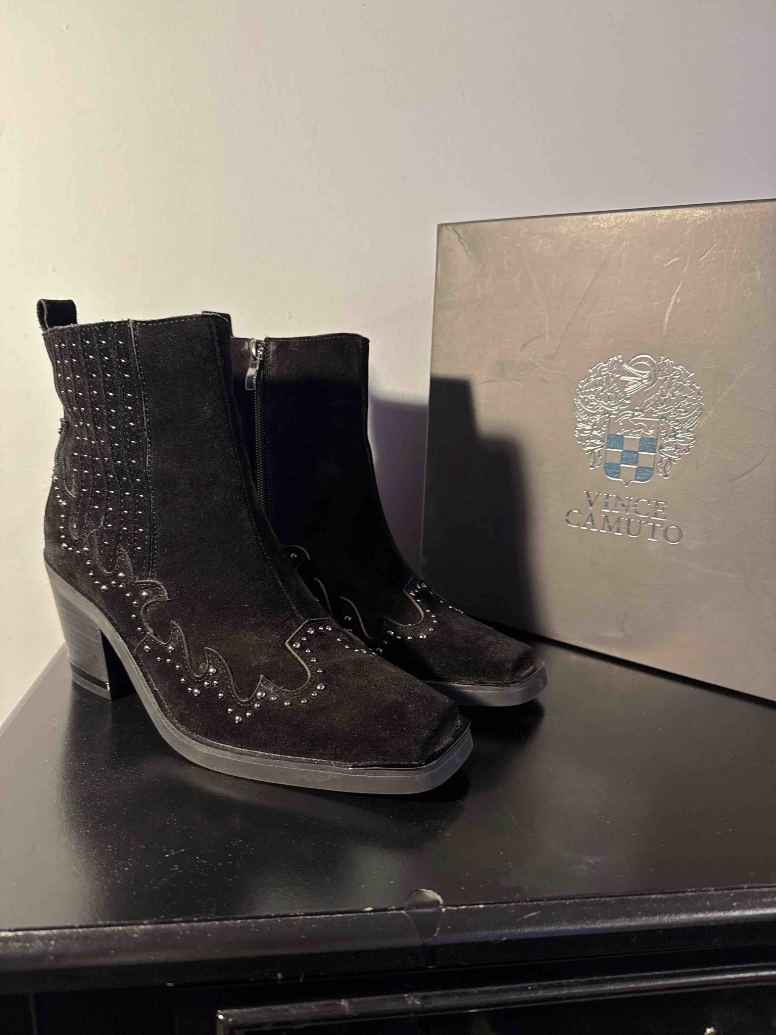 This pair of ankle-length booties is crafted from deep black genuine suede, featuring a prominent square-toe silhouette that lends a modern edge to a classic Western aesthetic. The boots are distinguished by elaborate Western-inspired flame or scroll-style overlays along the vamp and shaft, which are meticulously highlighted by small, high-shine silver-toned metallic studs. These studs create a rhythmic, decorative pattern that follows the scalloped edges of the leather overlays. The footwear is constructed with a sturdy, stacked block heel that provides height while maintaining stability, featuring a subtle metallic detail inset at the inner heel corner. Functional design elements include a full-length tonal black zipper on the medial side for ease of entry and a pull-tab at the rear collar. The soles are finished in a matte black composite material. These shoes are presented with their original charcoal grey branded packaging, which displays the metallic silver Vince Camuto crest and logo. The condition appears to be excellent or 'like-new,' showing no significant compression of the suede nap, scuffing on the toe boxes, or visible wear on the outsoles. This style represents early-21st-century contemporary fashion, blending bohemian chic with urban structural elements.