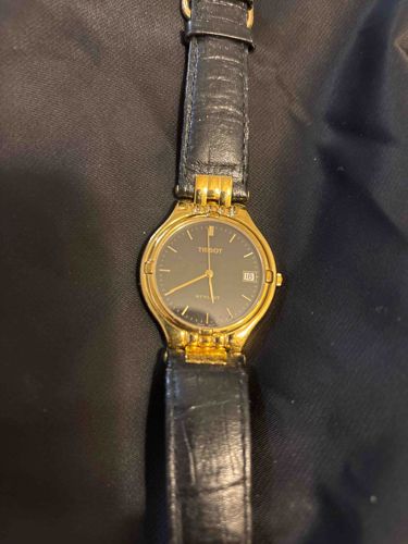 This is a vintage Tissot 'Stylist' series wristwatch, likely dating from the 1990s. The timepiece features a round, gold-plated stainless steel case with integrated triple-lug designs where it meets the strap. The dial is a deep matte black, providing a high-contrast background for the slender, gold-tone baton hour markers and matching stick hands. A date window is positioned at the 3 o'clock mark, accented with a white numeric wheel. The 'Tissot' brand name is printed in gold below the 12 o'clock position, with the 'Stylist' model name printed above 6 o'clock. The watch is powered by a Swiss quartz movement. It is currently fitted on a black leather strap with a crocodile/alligator grain texture and a gold-tone buckle. In terms of condition, there is visible surface wear and fine scratching on the gold plating, particularly on the bezel and the lugs, suggesting regular use. The leather strap shows significant creasing and signs of wear near the lugs and the buckle holes. The crystal appears relatively clear but may have minor micro-abrasions consistent with age. This watch exemplifies the slim, dress-watch aesthetic popular in late 20th-century Swiss watchmaking, prioritizing elegance and functional simplicity.
