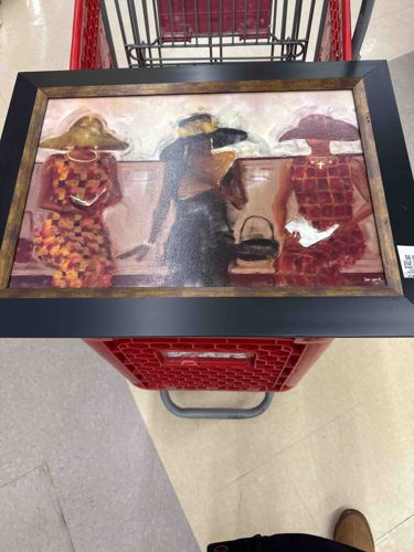 This item is a contemporary framed decorative art print depicting three African American women dressed in formal attire, seated on a church pew or at a social event. The central figure is dressed in black with a gold-trimmed hat, flanked by women in vibrant patterned red and gold dresses. The artwork employs a stylized, impressionistic aesthetic with faceless figures, focusing on fashion, posture, and elegance. The medium appears to be a textured print on board or canvas, designed to mimic the appearance of paint strokes. The piece is housed in a modern dual-tone composite frame featuring a wide matte-black outer border and a thinner metallic bronze or faux-gold inner fillet. Notable details include stylized accessories such as broad-brimmed Sunday hats, a cross necklace on the woman to the right, and a purse. A small artist's signature is visible in the lower-right corner, though it is illegible in the photo. The condition appears fair to good; there is a visible tear or significant abrasion on the right-side woman's lap area, revealing the white substrate beneath the print. A retail price sticker is attached to the right side of the frame, suggesting it is a mass-produced home decor item from the late 20th or early 21st century.