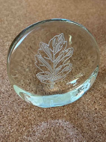 This item is a decorative solid glass or crystal paperweight, characterized by its rounded, pebble-like ovoid shape. The piece is crafted from high-clarity clear glass with a substantial thickness, featuring a flattened base that allows it to stand upright for display. The primary decorative element is an intaglio-etched or sandblasted motif of an oak leaf, centrally positioned on the front face. The etching is executed with a frosted white finish that creates a sharp contrast against the transparent glass body. The leaf design includes detailed vein structures and a lobed profile typical of the Querus genus. Physically, the glass exhibits high brilliance and light refraction, suggesting a lead crystal or high-quality optical glass composition. The construction appears to be molded and then hand-polished, common in mid-to-late 20th-century decorative glassware (circa 1970s-1990s). The condition is excellent with no visible chips, cracks, or significant fleabites along the edges. There is a slight distortion visible through the glass, which is a natural characteristic of a thick lens-like object. No specific maker's marks or signatures are immediately visible in the provided view, though its style is reminiscent of Scandinavian or American glass houses such as Mats Jonasson, Orrefors, or Steuben.