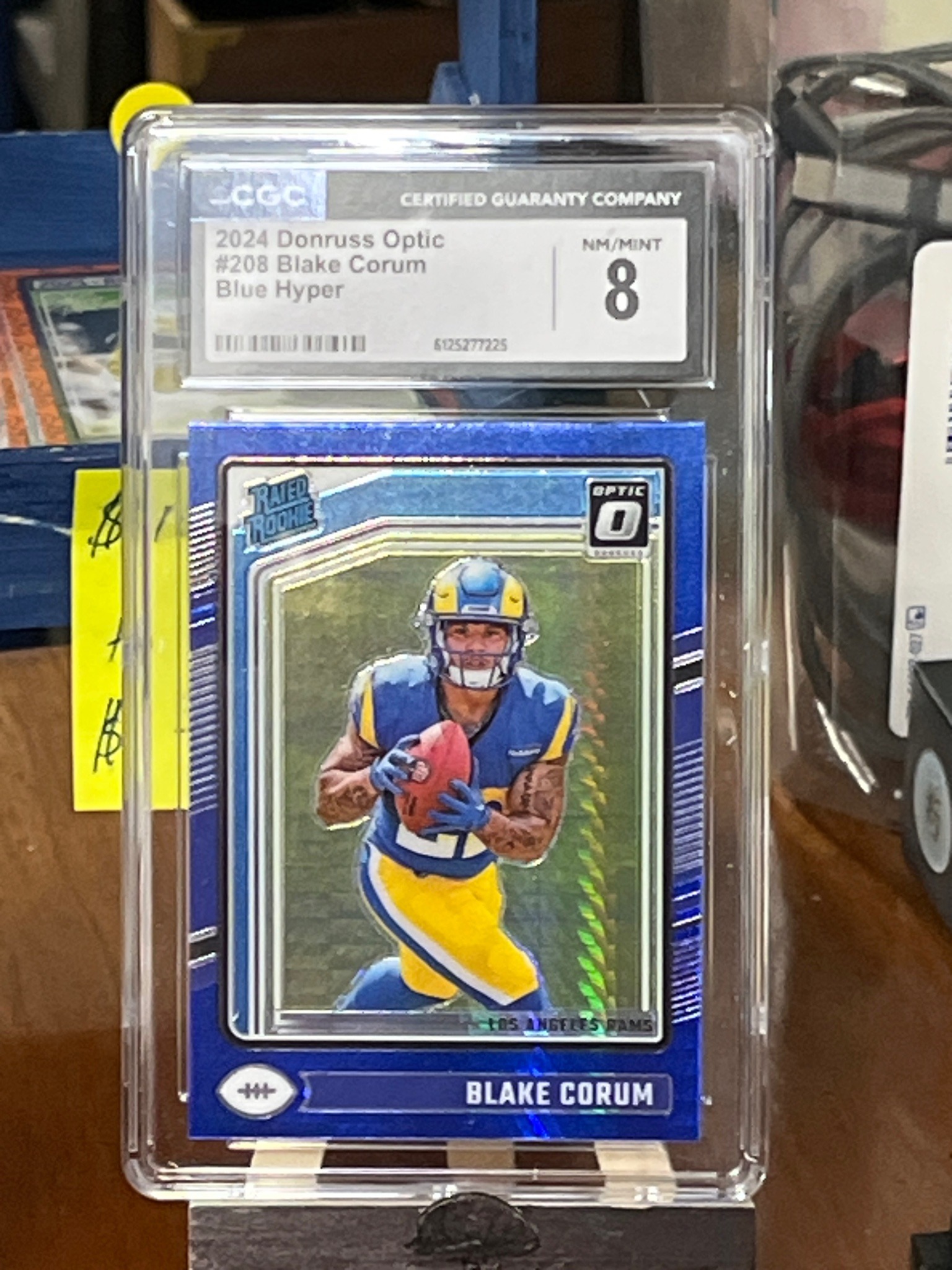 This is a 2024 Donruss Optic football card featuring Blake Corum, a rookie running back for the Los Angeles Rams. The card is a 'Blue Hyper' parallel, distinguished by its vibrant, refractive blue foil background with a unique 'hyper' pattern that creates a prismatic light effect. The card features the 'Rated Rookie' logo in the top left and the 'Optic' brand logo in the top right. Corum is depicted in his full Rams uniform, carrying a football. The card is professionally encapsulated in a CGC (Certified Guaranty Company) hard plastic slab for protection and authentication. The label at the top indicates a grade of NM/MINT 8, signifying that while the card is in superior condition, it may have minor imperfections such as slight surface wear or minor corner softing that prevented a higher grade. The certification number 6125277225 is visible for registry verification. The centering appears slightly heavy toward the left and bottom borders, which is a common manufacturing variance in modern trading cards. The craftsmanship reflects Panini's high-end Optic line, utilizing chromium technology for a stiff, metallic feel and premium visual appeal.
