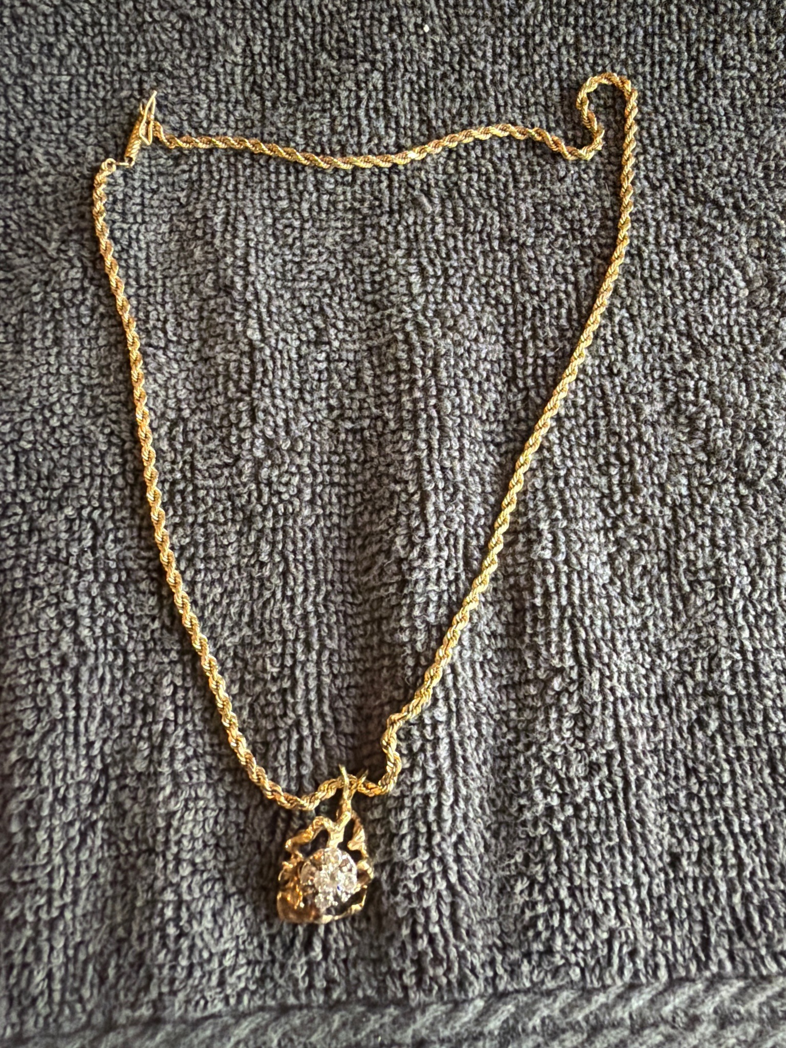 This jewelry piece consists of a yellow gold rope chain paired with a freeform, nugget-style pendant centered with a cluster of diamonds. Based on the provided context, the item is crafted from gold and set with natural diamonds. The chain is an classic rope design, characterized by multiple intertwined links that create a spiraling, rope-like texture. In the image, the chain appears to have a slightly irregular kink or bend near the pendant connection, suggesting a possible tensile stress point. Use of rope chains was highly popular from the 1970s through the 1990s. The pendant features a rugged, organic gold frame often referred to as 'nugget' or 'freeform' design, which frames a central multi-stone setting. This setting contains several smaller round brilliant-cut diamonds tightly clustered to provide the illusion of a larger single stone. The gold exhibits a warm, bright yellow patina consistent with 10k or 14k purity. There are no clearly visible maker's marks or hallmarks in the image, though they would typically be found on the clasp or the reverse of the pendant. The overall condition appears used but intact, with some minor tangling visible in the links.