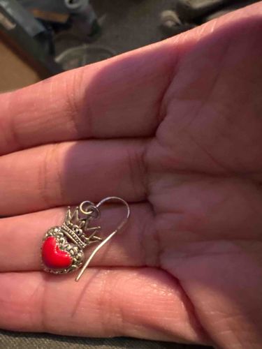 This is a single earring featuring a 'Coronet' or 'Crowned Heart' design, a signature motif of the jeweler James Avery. The piece is crafted from sterling silver, characterized by its bright metallic finish and intricate textural details. The central element is a puff heart filled with vibrant red enamel, surrounded by a beaded or millgrain-style border. Surmounting the heart is a detailed five-pointed crown with beaded accents. The earring is a drop style, suspended from a sterling silver French ear wire. Physically, the item is petite, likely measuring approximately 0.5 to 0.75 inches in length. The construction shows high-quality casting with clear definition in the crown's points and the decorative heart border. Condition appears fair to good; while the enamel is intact and bright, there is visible dark oxidation or patina in the recessed areas of the silver, which is common for aged sterling. Based on the style and craftsmanship, this modern heirloom piece likely dates from the late 20th to early 21st century. The use of kiln-fired enamel over sterling silver indicates superior craftsmanship compared to mass-market costume jewelry.