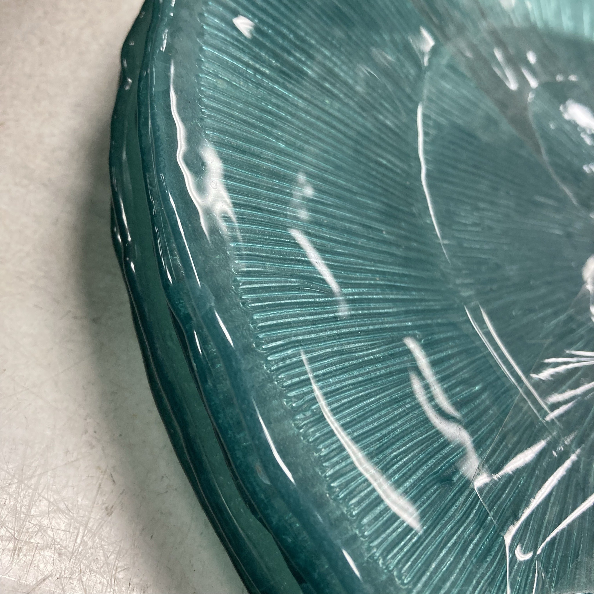 A set of four circular glass dinner plates featuring a distinctive teal or deep turquoise translucency. The design follows a contemporary organic aesthetic, likely from the Corelle Hearthstone 'Simplicity' or 'Lake' collection, dating from the late 20th to early 21st century. The plates are constructed from heavy pressed glass with a smooth, glossy top eating surface and a highly textured underside. This texture consists of dense, radial ribbing or 'rippled' lines that catch and refract light, emanating from the center toward a gently scalloped or irregular 'hand-finished' style rim. These undulations on the edge provide a rustic, artisan appearance that contrasts with the uniformity of the pressed pattern. The glass is thick and durable, exhibiting quality craftsmanship typical of modern consumer glassware meant for daily use. Condition-wise, the plates appear to be in good utilitarian state, though they are currently bound together with clear adhesive packing tape, which may leave residues or conceal small rim chips. No major cracks or deep scratches are visible in the provided view, but light surface wear consistent with stacking is to be expected. There are no immediate visible maker’s marks in the crop, but these typically feature backstamps on the bottom center.