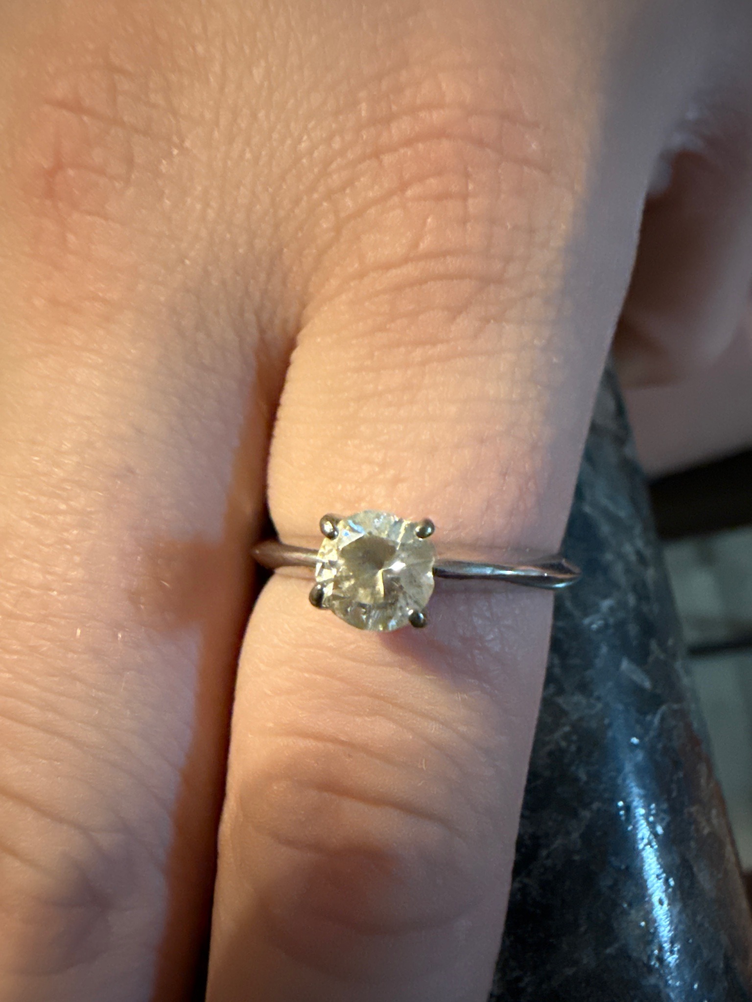This jewelry piece consists of a classic solitaire engagement-style ring. It features a center-set round brilliant cut gemstone, likely a diamond, estimated at approximately 0.75 to 1.00 carat based on visual proportions relative to the finger. The stone is held securely by a traditional four-prong setting. The metal band is a slender, high-polish rounded shank, appearing to be white gold or platinum based on its cool silvery luster. Upon close inspection, the gemstone displays a slight warm yellowish or champagne tint, suggesting a color grade in the I-K range on the GIA scale. There are visible inclusions or 'feathers' near the center facet, which indicates a clarity grade in the Slightly Included (SI) category. The craftsmanship shows a minimalist modern style common in the late 20th to early 21st century. The condition appears fair to good tip wear; the prongs show some rounding from use, and there is minor surface scratching on the metal band consistent with daily wear. No visible maker’s marks are discernible from the top view, though they would typically be located on the inner shank. The overall design is timeless, focusing on the light performance of the central stone.