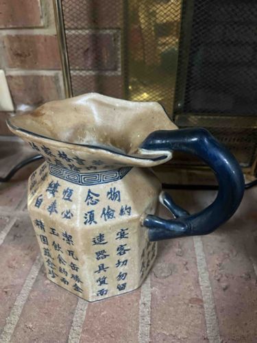 This is a vintage-style ceramic pitcher featuring a unique hexagonal faceted body and a wide, ruffled rim. The vessel is constructed from a cream-colored glazed ceramic, decorated with cobalt blue underglaze calligraphic characters that appear to represent traditional proverbs or Chinese poetry. The collar of the pitcher is embellished with a classic blue geometric Greek key or 'fret' border. A distinguishing feature is the dark blue handle, which is modeled to resemble a gnarled tree branch or root, attaching to the body at three distinct points. The piece exhibits a heavy craquelure throughout the glaze, which may be intentional to simulate age (crackleglaze) or a result of true crazing over time. Condition-wise, there is visible surface staining on the interior rim and some darkening on the exterior facets, suggesting it has been used for liquids or has sat in a dusty environment. The overall craftsmanship suggests a 20th-century interpretation of classic Chinese stoneware or export-style pottery. There are no maker's marks visible in this view, but the irregular shape of the rim indicates a molded or hand-finished process that favors rustic charm over formal precision.