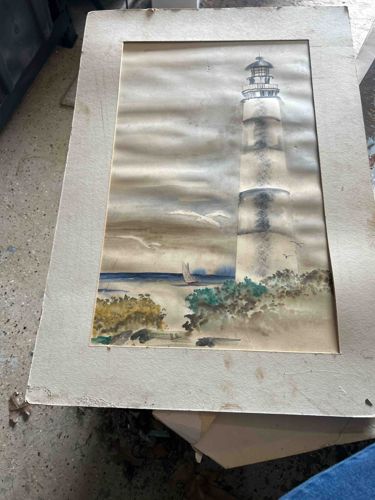 This item is an original watercolor painting on paper, depicting a prominent vertical lighthouse overlooking a beach and sea. The artwork is rendered in a muted palette featuring sepia, gray, blue-green, and earthy tones. The composition includes a large lighthouse as the primary focal point on the right, seagulls in flight, a small sailboat on the horizon, and coastal vegetation in the foreground. Physically, the paper shows significant structural and condition issues, including heavy horizontal buckling or 'cockling' across the entire surface, likely caused by past moisture exposure or humidity fluctuations without proper support. The paper has significant foxing (small brown age spots) and general yellowing (toning), particularly visible in the sky area. The outer cardboard matting is in poor condition with visible water stains, dirt, and fraying along the edges and corners. There is no visible artist signature on the lower portion of the work, suggesting it may be the work of a student, hobbyist, or an unlisted artist from the mid-20th century. The craftsmanship shows a loose, translucent application of pigment typical of classical watercolor techniques, though the poor storage conditions have severely impacted its preservation.