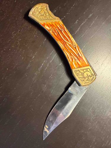 Vintage Folding Pocket Knife with Engraved Brass Bolsters and Stag Horn Scales