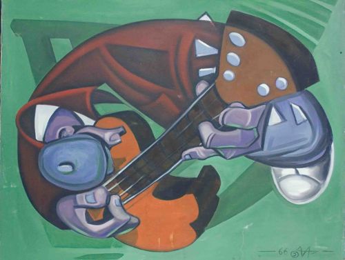 This is a dynamic 20th-century gouache or tempera painting on paper, measuring approximately 2193 x 1584 pixels in its digital representation. The composition is executed in a late Cubist or Futurism-inspired style, depicting a stylized figure playing a guitar. The artist uses a palette of earthy ochre, deep russet reds, and muted violets against a vibrant sage-green background. The anatomical features are heavily abstracted, with large, blocky hands and limbs that swirl around the central instrument, creating a sense of rhythmic movement. The application of paint appears opaque and matte, consistent with gouache, with visible layering to create shadows and highlights that give the shapes a three-dimensional, tubular quality. A notable feature is the monogram signature and date '66' located in the bottom right corner, suggesting the piece was created in 1966. The work shows character consistent with its age, including minor surface scuffs and edge wear, but the pigment remains saturated. The craftsmanship exhibits a confident handling of geometric forms and a sophisticated understanding of balance and negative space.