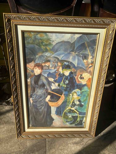This item is a large-format framed reproduction of the famous Impressionist painting 'Les Parapluies' (The Umbrellas) originally created by Pierre-Auguste Renoir between 1881 and 1886. The artwork displays a bustling Parisian street scene filled with figures carrying blue umbrellas, with a central female figure holding a basket. The print appears to be a lithograph or high-quality photomechanical print on textured paper or canvas, designed to mimic the original oil painting's appearance. It is housed in an ornate, multi-layered frame featuring a wide, gilded outer moulding with a repeating acanthus leaf or scroll pattern, a champagne-colored linen or canvas liner (mat), and a thin gilded inner fillet. The frame's construction suggests mid-to-late 20th-century mass production, likely between 1970 and 1990. In terms of condition, there is visible dust accumulation on the frame and liner. The frame shows minor surface abrasions and some darkening of the gilding, consistent with age and display in a residential environment. No visible moisture damage or significant fading is apparent from the image, though the colors appear slightly more muted than the original masterpiece, which is currently held in the National Gallery, London. The overall craftsmanship of the framing is solid, intended for decorative home use rather than museum-grade preservation.