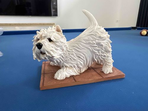 This is a detailed ceramic resin figurine depicting a West Highland White Terrier (Westie) in a playful 'play bow' stance. The item is manufactured by Sherratt & Simpson, a company known for lifelike animal studies. The figurine features a highly textured surface that simulates the dog's characteristic double coat, with deeply carved ridges mimicking coarse white hair. The terrier is set upon an integral rectangular plinth designed to resemble terracotta tiling with visible grout lines. The dog's face is rendered with high realism, featuring dark, glossy eyes, a prominent black nose, and subtle pinkish tones on the interior of the ears. The construction is likely cold-cast resin, a common medium for the maker, allowing for fine-line detail. Measuring approximately 4 to 6 inches in length, the piece is in very good vintage condition with no visible chips, cracks, or repairs. The white finish remains bright without significant yellowing. Sherratt & Simpson pieces from this era (likely late 20th century) are prized for their anatomical accuracy and captures the energetic temperament of the breed. The bottom likely contains a manufacturer's sticker or incised mark, though it is not visible here. Quality is indicated by the crispness of the fur molding and the lack of visible casting seams.