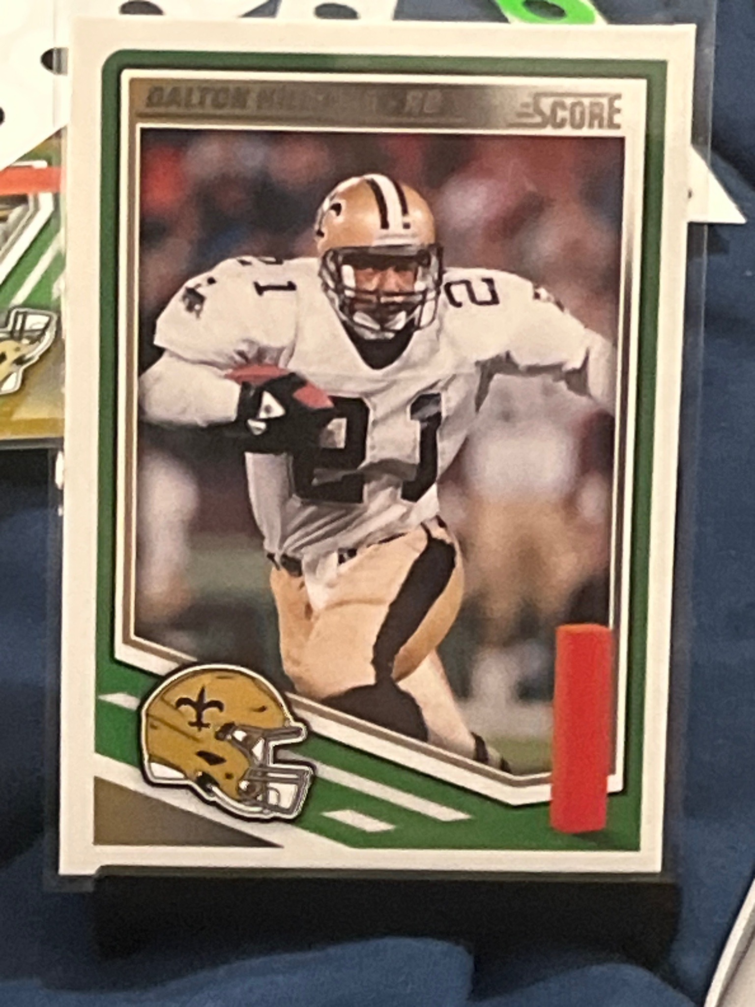 This is a 1991 Score brand football trading card featuring Dalton Hilliard, the running back for the New Orleans Saints. The card measures approximately 2.5 by 3.5 inches and is constructed of standard thin cardboard stock with a glossy finish on the front. The design features a white outer border and a green inner border framing an action shot of Hilliard in his white #21 Saints jersey, carrying the football. The 'Score' brand logo is visible in the top right corner, and his name is printed in the top left. The bottom left features a graphic of a Saints helmet, while the bottom right contains a red pylon graphic. The photograph shows a shallow depth of field with a blurred stadium background. In terms of condition, the card appears to be in 'raw' ungraded state, currently housed in a plastic sleeve. The centering appears slightly heavy toward the left and top borders. The corners show some minor soft rounding, particularly visible at the bottom left. The surface gloss seems intact without major scratching, though some edge wear is visible along the green border lines. This card represents a mass-produced sports collectible from the 'junk wax' era of the early 1990s.
