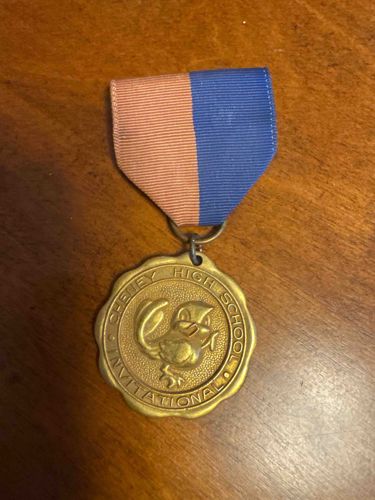 This is a vintage participation or achievement medal from a Cheney High School Invitational event, dated to approximately 1974. The medal features a die-cast, circular medallion with a distinctive scalloped or wavy decorative edge, crafted from a base metal with a brass or gold-tone finish. The center of the obverse showcases a stylized, cartoon-like mascot character, which appears to be a bird-like figure in a dynamic pose, set against a textured, pebbled background. Surrounding the mascot is a raised-letter border that reads 'CHENEY HIGH SCHOOL' on the top arc and 'INVITATIONAL' on the bottom arc. The medallion is suspended by a small jump ring from a two-toned grosgrain ribbon draped in a horizontal fold style, featuring a vertically split salmon-orange and royal blue color scheme. Measuring approximately 1.5 inches in diameter for the medal alone, the piece displays a characteristic aged look with a darkened patina in the recessed areas and minor surface oxidation. The ribbon shows slight fraying at the edges and minor fading consistent with age. This item is a classic example of mid-to-late 20th-century scholastic awards, demonstrating standard mass-production techniques used for high school athletic or academic competitions during the 1970s.