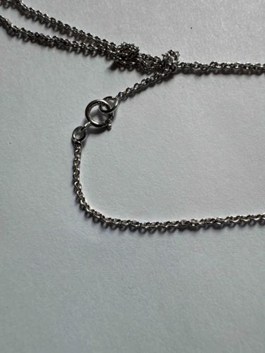 This item is a contemporary fine cable style chain necklace, likely constructed of 925 sterling silver or white gold based on its bright white metallic luster. The chain features uniform, interlocking oval links of a delicate gauge, commonly used for displaying light pendants. The fastening mechanism is a standard spring-loaded bolt ring (also known as a spring ring clasp) attached via a soldered jump ring. While specific hallmark stamps are not legible in the provided lighting, the presence of a jump ring and the clasp style are indicative of commercial high-quality jewelry manufacturing from the late 20th century to the present. The metal surface appears to be in good condition with a bright, reflective finish, showing no significant oxidation or tarnishing typical of poorly stored silver. There is a visible knot or heavy tangle in the upper portion of the chain, which is a common condition issue for fine-gauge chains and could lead to kinking or link stretching if not untangled professionally. The overall craftsmanship suggests a machine-made, durable everyday jewelry piece with a modern, minimalist aesthetic suitable for contemporary wear.
