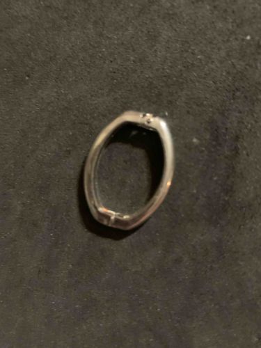 This item is a functional jewelry component, specifically a hinged oval clasp or an enhancer bail designed for necklaces. It is constructed from a polished silvery-white metal, which could be sterling silver, stainless steel, or a rhodium-plated base metal based on its cool-toned luster and reflective surface. The item features a distinctive elongated oval shape with a break in the frame, indicating a mechanical opening mechanism. A visible hinge is located at the bottom of the piece, allowing the two curved segments to pivot apart. At the top apex, there is a small indent or pin associated with a magnetic or snap-lock closure system, as commonly seen in 'easy-on' jewelry findings. The surface shows minor micro-scratches and surface wear consistent with handling, but no significant tarnish, suggesting it may be a contemporary piece or made from a non-oxidizing alloy. The modern, minimalist design lacks ornate engraving or filigree, focusing instead on streamlined utility and a high-shine finish. There are no visible maker's marks or hallmarks in this view, although such marks are often found on the interior shank of such components. Its craftsmanship appears to be industrial and precise, typical of high-quality modern findings used for modular jewelry or interchangeable pendants.