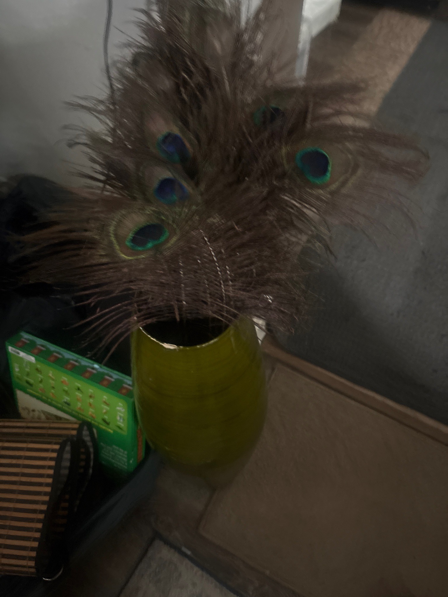 Arrangement of Peacock Tail Feathers in a Green Glazed Ceramic Vase