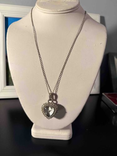 This item is a costume jewelry pendant watch featuring a heart-shaped locket design. The pendant is crafted from a silver-toned base metal, possibly brass or alloy with a rhodium or nickel plating. The front of the heart-shaped case is bordered by a halo of small, round-cut clear crystals (likely rhinestones or cubic zirconia) in a pavé-style setting. The center of the locket features a transparent protective cover, possibly glass or acrylic, revealing a small analog watch face within. The watch face appears to have a simple white or silver dial with minimal markers and two small hands. The pendant hangs from a matched silver-tone curb or cable style chain with a visible bail that also appears to be encrusted with small clear stones. The construction suggests a contemporary mass-produced item, likely from the late 20th to early 21st century. The condition appears fair to good, with some minor surface scratches on the metal and crystal cover consistent with light wear. The polish is bright, and no stones appear to be missing from the provided viewing angle. This style of 'pendant watch' was popularized in the late 1990s as a romantic and functional accessory. There are no clearly visible maker's marks or hallmarks in the image, suggesting it is a commercial fashion jewelry piece rather than fine jewelry.