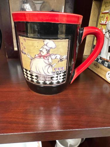 This is a large ceramic coffee mug featuring a classic "Fat Chef" bistro motif, a popular kitchen decor theme from the early 2000s. The mug's exterior is primary black with a bold, glossy red rim and handle. It features a central rectangular decal depicting a whimsical, mustachioed chef wearing a white toque and apron with a red neckerchief. The chef is shown cooking with a frying pan on a black-and-white checkered floor, set against a parchment-colored background. The decorative style is indicative of mass-produced earthenware or stoneware typically sold in home goods stores during the late 20th to early 21st century. The construction features a tapered body and a generous C-shaped handle for ergonomic grip. In terms of condition, the mug shows a high-gloss glazed finish with no immediate signs of major structural cracking or large chips visible from the front view, though there is potential fine surface scratching consistent with shelf wear. The color saturation of the red and black glazes remains vibrant. There are no maker's marks visible on the body; such items are frequently branded on the bottom with names like 'Certified International' or 'Tabletops Unlimited' or made as generic boutique kitchenware. The overall craftsmanship is commercial grade, designed for both functional use and decorative display in a Tuscan-inspired kitchen.