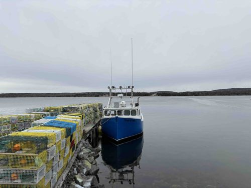 Commercial Lobster Fishing Vessel and Stacked Lobster Traps