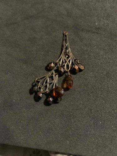 This item is a vintage-style decorative tassel pendant, likely an component of a necklace or earring, featuring intricate openwork filigree metal construction. The metal possesses an aged brass or bronze-tone patina, suggesting it is composed of a base metal alloy. The design is bifurcated into two main sections that flare out from a central top loop. Suspending from the delicate wire work are several faceted glass beads in shades of smoky amber and deep bronze. These beads are pear-shaped (briolette) and round-faceted, secured by small jump rings. The construction utilizes a 'spider-web' or 'mesh' wire technique popular in mid-20th-century costume jewelry. Notably, the piece exhibits a vintage character with visible oxidation on the metal surfaces, which adds to its antique aesthetic. There are no visible maker's marks or stamps on the front, consistent with many costume pieces from the 1940s to 1960s. The condition appears fair to good; however, there is some unevenness in the tassel hang, which may indicate slight wire warping over time. The craftsmanship is decent, showing detailed wire-bending and bead-attachment work. This design style evokes the Art Nouveau revival or Victorian-style costume jewelry common in the mid-century era, intended to mimic the appearance of more expensive fine jewelry through the use of glass and gold-toned plating.