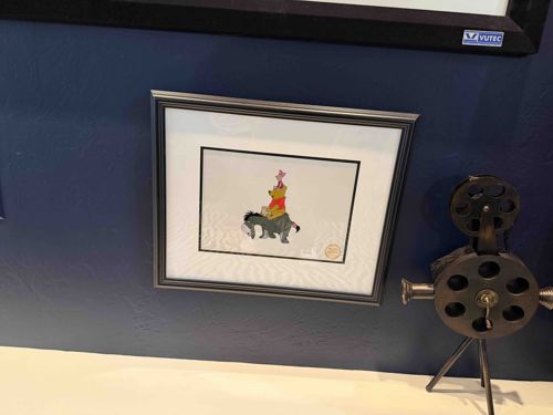This is a framed Walt Disney production animation cel featuring the characters Winnie the Pooh, Piglet, and Eeyore. The artwork depicts a hand-painted character scene on a transparent cellulose acetate sheet, commonly known as a 'cel.' In the scene, Eeyore is seen carrying Winnie the Pooh on his back, who in turn is holding up Piglet. The colors appear vibrant, specifically Pooh's signature yellow fur and red shirt, Piglet's pink tones, and Eeyore's muted grey. The cel is professionaly matted with a dual-layer white and black matting system, which provides depth and focuses the eye on the central action. A critical value indicator is the gold 'The Walt Disney Company' seal of authenticity located in the lower right-hand corner, suggesting this is an official studio release or Sericel. The frame is a modern dark grey or black metallic-style frame with subtle ribbing. The cel appears to be in excellent condition with no visible signs of paint flaking, discoloration, or 'vinegar syndrome' warp. The presentation suggests it may be from a late 20th-century Disney production or a limited edition commemorative release, showcasing high-quality studio craftsmanship and ink-and-paint application.
