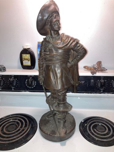 This is a large cast metal statuette depicting a 17th-century style European Cavalier or Musketeer. The figure stands in a proud, dynamic contrapposto pose, wearing a wide-brimmed floppy hat, a tunic with a heavy sash, wide-cuffed bucket boots, and a flowing cape draped over the left shoulder. The right hand rests on a long rapier sword that extends to the circular plinth base. The piece features a deep brown, almost black, patinated bronze finish over what appears to be white metal (likely spelter or pot metal), common in late 19th to early 20th-century decorative arts. The craftsmanship shows intricate detailing in the folds of the garments, the facial hair, and the texture of the sash. The circular base is integral to the casting and shows significant wear along the edges. Visible condition issues include some loss of the dark bronzed finish on high-relief points like the toe of the boot and the brim of the hat, revealing a lighter metal underneath. There is surface dust, minor scratches, and potential slight bending of the sword blade. No maker's marks are immediately visible in the image, but the style is consistent with French or European 'Troubadour style' Romanticism from the 1880-1910 period.
