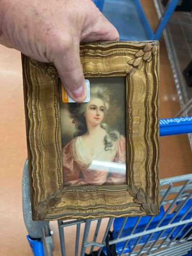 This item is a small-scale portrait print housed in a prominent, ornate frame. The internal artwork depicts a young noblewoman styled in the manner of the late 18th century, likely a reproduction of a Rococo-era painting. She features powdered high-style hair adorned with a ribbon, pale skin, and is dressed in a low-cut pink gown with white chemise ruffling. The frame is the most significant physical component, constructed of wood or composite material with a heavy gold-toned (gilt) finish. It is approximately 5x7 inches in total size. The frame features deep relief carving with a wave-like texture on the rails and shell-like or foliate motifs at the four corners. The finish shows a dark antiquing patina intended to give the piece an aged aesthetic. The condition appears fair to good; there is visible wear along the outer edges of the frame where the gold leaf or paint has rubbed away to reveal the darker base material. A white price sticker is adhered directly to the glass surface under the thumb of the person holding it. While the subject matter mimics 18th-century French portraiture (similar to the work of Vigée Le Brun), the construction suggests it is a mid-20th-century decorative reproduction rather than a period original. The craftsmanship of the frame shows mass-production characteristics, such as uniform shell moldings and a faux-antique wash.