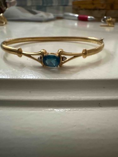 This item is a slender hinged bangle bracelet crafted in yellow gold, likely 10k or 14k based on its vibrant yellow hue and common contemporary jewelry standards. The central decorative element features a bezel-set oval-faceted gemstone, which exhibits a deep teal-blue color characteristic of London Blue Topaz. Flanking this central stone are two small, round brilliant-cut diamonds, each set within a split-shank or bypass-style architectural mounting that tapers into the main body of the bangle. The metalwork includes minor decorative ridges or collets on either side of the focal point, transitioning into a smooth, thin circular band. The bangle features a integrated hinge and a traditional tongue-and-groove clasp, possibly including a safety catch on the side. The surface appears to be in good pre-owned condition with light surface scratches and minor tarnish consistent with occasional wear. The style is classic and minimalist, suggesting a late 20th-century to early 21st-century manufacturing date. The craftsmanship shows clean casting and secure setting indicative of commercial fine jewelry quality. No immediate stamps or signatures are visible in the image, but such pieces are typically hallmarked on the interior shank near the hinge or clasp.