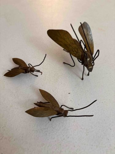 This set consists of three stylized insect sculptures, likely representing flies or cicadas, crafted from a combination of metals including brass and steel wire. The collection features two smaller insects and one significantly larger figure, demonstrating a graduated scale. The bodies appear to be made of solid brass or bronze-toned metal with a warm, aged patina. The wings are constructed from thin, hammered metal sheets featuring delicate hand-etched or stamped vein-like textures to simulate biological realism. The legs and long antennae are fashioned from thin iron or steel wire that has been hand-bent into shape and spot-welded to the main bodies. The largest insect is positioned in an upright, poised stance, while the smaller two are designed to rest low to a surface. The overall style is reminiscent of mid-century modern brutalism or folk art from the late 20th century. Condition is good overall, showing a natural oxidation and darkening of the metal surfaces typical for their age, with some minor bending to the wire appendages. There are no visible maker's marks, suggesting these may be artisan or boutique-crafted pieces rather than mass-produced items. The craftsmanship is expressive, focusing on structural form and the interplay of different metallic finishes.