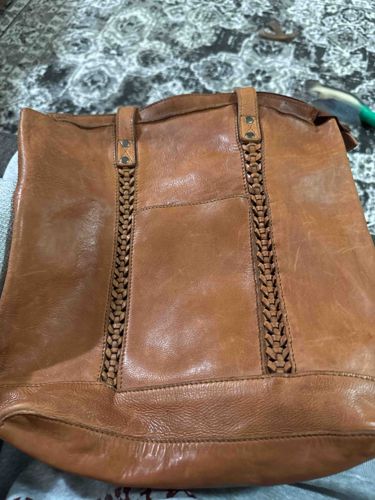 Vintage-Style Tan Leather Tote Bag with Woven Detailing