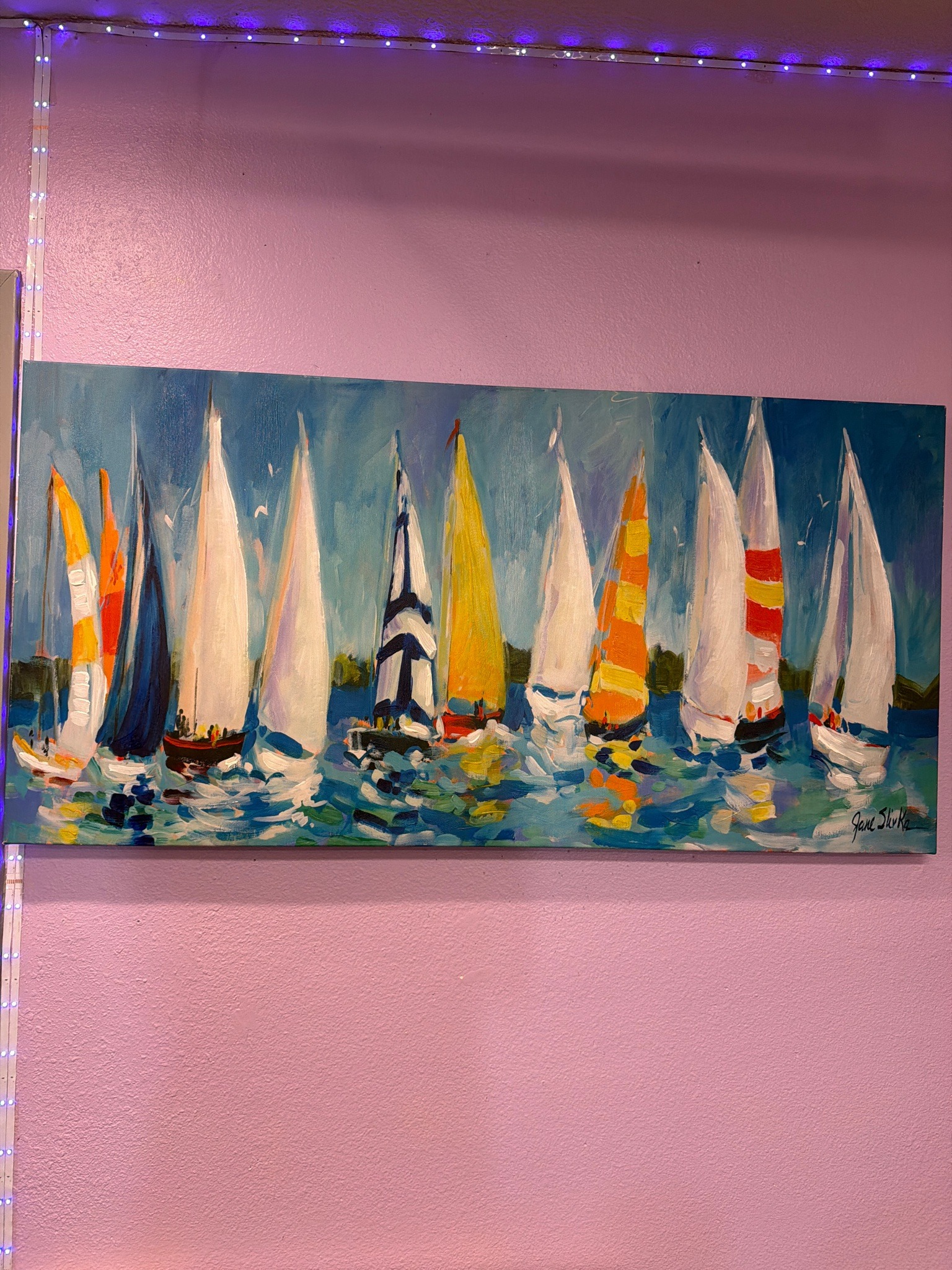 This is an original impressionist painting on canvas featuring a nautical regatta scene. The artwork depicts a line of approximately ten sailboats gliding across blue water, likely executed in acrylics given the vibrant colors and fast-drying layering. The style is characterized by bold, expressive, and thick brushstrokes, particularly in the white and yellow sails and the choppy, reflective water surface. The color palette is vivid, utilizing bright primary colors like yellow, orange, and blue against crisp white sails, creating a high-contrast and energetic summer atmosphere. The piece is signed 'Jane Slivka' in the lower right corner, a contemporary American artist known for her use of light and active brushwork. The canvas is a wide horizontal format, suitable for over-mantel or large wall placement. It appears to be a gallery-wrapped canvas as no frame is present, and the painting continues or ends cleanly at the edges. The condition appears excellent with no visible signs of cracking, paint loss, or sagging canvas. The craftsmanship reflects a confident, professional hand with an emphasis on movement over fine detail, typical of Slivka's modern impressionist style from the late 20th to early 21st century.