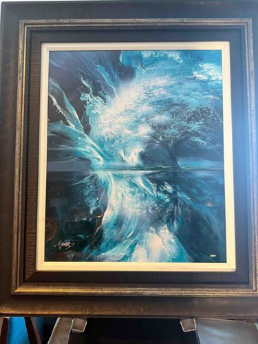 This item is a contemporary abstract landscape painting displayed in a multi-tiered, professional gallery frame. The artwork predominantly features a palette of cool tones, specifically shades of cerulean, turquoise, navy, and white. The composition uses fluid, sweeping brushstrokes and possibly palette knife work to create a sense of dynamic movement, resembling a rushing waterfall or a celestial burst of energy. To the right of the central white focal point, a silhouette of a deciduous tree provides a grounded, figurative element against the ethereal background. The piece appears to be an oil or acrylic on canvas. It is signed in the lower-left corner with a stylized signature, likely from a 21st-century contemporary artist. The framing is substantial, consisting of a broad, dark brown textured outer frame with a silver-toned inner lip and a white linen-style liner that provides a visual buffer between the frame and the art. The condition of the visible painting surface is excellent, with no apparent signs of cracking, fading, or moisture damage. The craftsmanship of the frame is high-quality, suggesting a piece intended for modern interior decor or gallery sale. Overall, the work reflects a blend of traditional landscape symbols with modern abstract expressionist techniques.