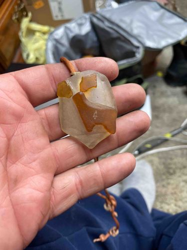 This item is a handcrafted pendant featuring a unique assembly of sea glass. The primary component is a large, translucent frosted white or light seaglass shard serving as the base. Adhered to the surface are three smaller amber or brown sea glass pieces arranged to resemble a stylized animal, likely a cow or ox. The central amber piece forms the body and head, while two smaller upper pieces represent ears or horns. The pendant is secured at the top with a thin gold-toned wire wrap that forms a bail, through which a brown leather or cord necklace is threaded. The sea glass components exhibit a natural frosted patina consistent with tumbling in water over time, with rounded edges and a matte surface. The largest shard measures approximately 2 inches in length. There are no visible maker's marks, suggesting it is a contemporary artisan piece or a personal craft project. The condition is generally good, with the natural pitting and irregularities expected of beach-found glass. The craftsmanship is folk-art in style, relying on the organic shapes of the glass to suggest the animal form.