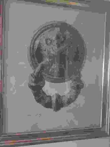 This is a monochrome drawing, identified by the user as a work by Paul Jouve (1878-1973), a significant figure in the Art Deco movement and a master animalier. The artwork depicts a monumental lion head door knocker, likely based on a Venetian or Renaissance prototype often studied by Jouve. Rendered in graphite or charcoal on paper, the work displays powerful chiaroscuro, utilizing heavy shadows to define the sculptural volume of the metallic ring and the ferocious feline expression. The lion's features are stylized with a focus on geometric structural integrity, synonymous with Jouve's Art Deco aesthetic. The piece is housed in a contemporary silver-toned frame with a wide mat. Visible condition appears stable, though a dark mark or artist signature/monogram is present in the lower-left quadrant of the paper. Jouve was known for his mastery of textures, which is evident here in the way the medium mimics the weathered patina of aged bronze. The perspective is front-facing, emphasizing the symmetry and imposing nature of the subject. Quality indicators include the sophisticated handling of light and the anatomical accuracy typical of a classically trained animalier artist. The work likely dates to the early-to-mid 20th century.