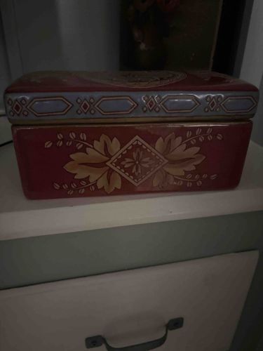 This is a rectangular ceramic trinket or vanity box, likely dating from the mid-20th century. The piece features a deep burgundy or maroon base glaze on the body and the lid. The front panel of the base is decorated with a transfer-printed or hand-painted botanical motif in a muted buff-ochre color, consisting of a central diamond-shaped floral crest flanked by acanthus-style leaves and delicate sprigs. The lid has a raised, stepped profile with a light-blue or periwinkle border containing a geometric pattern of elongated hexagons and diamonds. This decorative molding suggests a mid-century interpretation of French Neoclassical or Empire styles. The box appears to be constructed of a kiln-fired ceramic, possibly earthenware or stoneware, with a high-gloss finish. Regarding condition, there is a visible chip or loss of glaze on the lower-left corner of the lid's border, and the alignment of the lid to the base shows slight unevenness, common in mass-produced decorative ceramics. No specific maker’s mark is visible in the provided angle, but the style is characteristic of European export ware (French or Italian) or higher-quality Japanese ceramics from the 1960s. The interior is likely unglazed or white-glazed for utility. The overall craftsmanship displays intentional symmetry and a rich color palette suitable for a traditional dressing table or mantle.