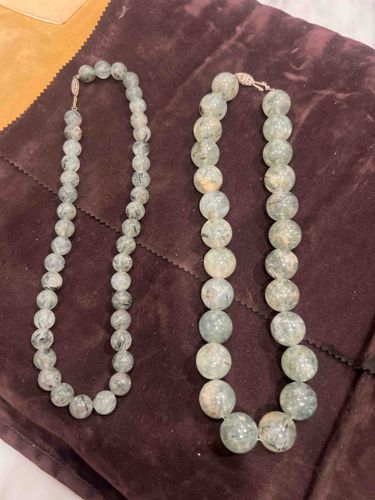 This pair consists of two rutilated quartz bead necklaces of varying scale. Both items feature round, highly polished translucent quartz beads containing needle-like rutilated inclusions, specifically black or dark green tourmaline needles (schorl). The smaller strand on the left features uniform beads approximately 8-10mm in diameter, while the right-hand strand is comprised of larger, substantial beads approximately 14-16mm in diameter. The stones exhibit a hazy, pale sage-green to clear body color with varying densities of needle inclusions, providing a natural, organic aesthetic. Each necklace is secured by a metallic filigree fishhook or 'box' style clasp, suggesting a mid-to-late 20th-century vintage construction or traditional jewelry design. The necklaces appear to be knotted between beads, a quality indicator that protects the gems from rubbing against each other and prevents loss if the thread snaps. The condition appears excellent with a high surface polish and no visible fractures or chips to the beads, though the silk or nylon thread should be inspected for tension and wear.