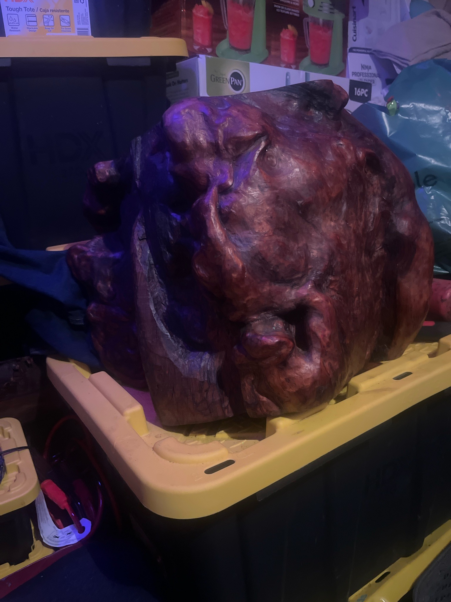 This is a substantial, naturally-occurring wood burl specimen, identified by the user as Borro wood, which has been hand-worked and polished into a decorative organic sculpture. The piece exhibits a rich, deep reddish-brown and mahogany color palette with complex, swirling grain patterns characteristic of burl growths. Its physical form is highly irregular and bulbous, featuring numerous protrusions, nodules, and internal cavities that create a dynamic interplay of light and shadow. The surface has been refined with a glossy finish, likely a hand-rubbed oil or lacquer, which enhances the depth of the iridescent 'chatoyancy' in the wood fibers. Notable features include a prominent central ridge that descends into a natural void or fissure, adding significant textural contrast between the smooth outer surfaces and the more rugged interior recesses. The craftsmanship involves careful removal of bark and stabilization of the wood, likely dating from the mid-to-late 20th century, a period when natural-edge and organic-form woodwork became highly collectible. In terms of condition, the piece shows a well-developed patina with some minor abrasions and dust accumulation consistent with long-term storage. There are some visible natural checking or drying cracks, which are expected in large-format wood specimens of this density, but no signs of significant post-production damage or structural repairs. The item sits on a flat-milled base, indicating it was intended for table-top or pedestal display.