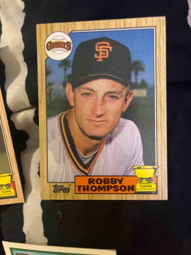 This is an original 1987 Topps baseball card featuring Robby Thompson of the San Francisco Giants. The card measures standard 2.5 by 3.5 inches and is constructed from typical cardboard stock of the late 1980s. The design is iconic for its faux wood-grain border, intended to evoke a classic aesthetic. The front features a color portrait photograph of Thompson in his Giants uniform and cap, framed by a thin blue line. Significant graphic elements include the 'Giants' team logo in a circular baseball icon at the top left, the player's name in an orange and black block at the bottom right, and the official Topps logo. Notably, it includes the 'Topps All-Star Rookie' gold cup emblem in the lower right corner, indicating his selection to the 1986 All-Star Rookie Team. In terms of condition, the corners show visible softening and wear, particularly visible on the upper left and lower right edges. The centering appears slightly shifted toward the top and right margins. No major creases or surface staining are immediately visible, though minor edge chipping is consistent with age and unprotected storage. This piece represents the 'Junk Wax Era' of sports collectibles, produced by Topps in the United States during the 1987 manufacturing run.