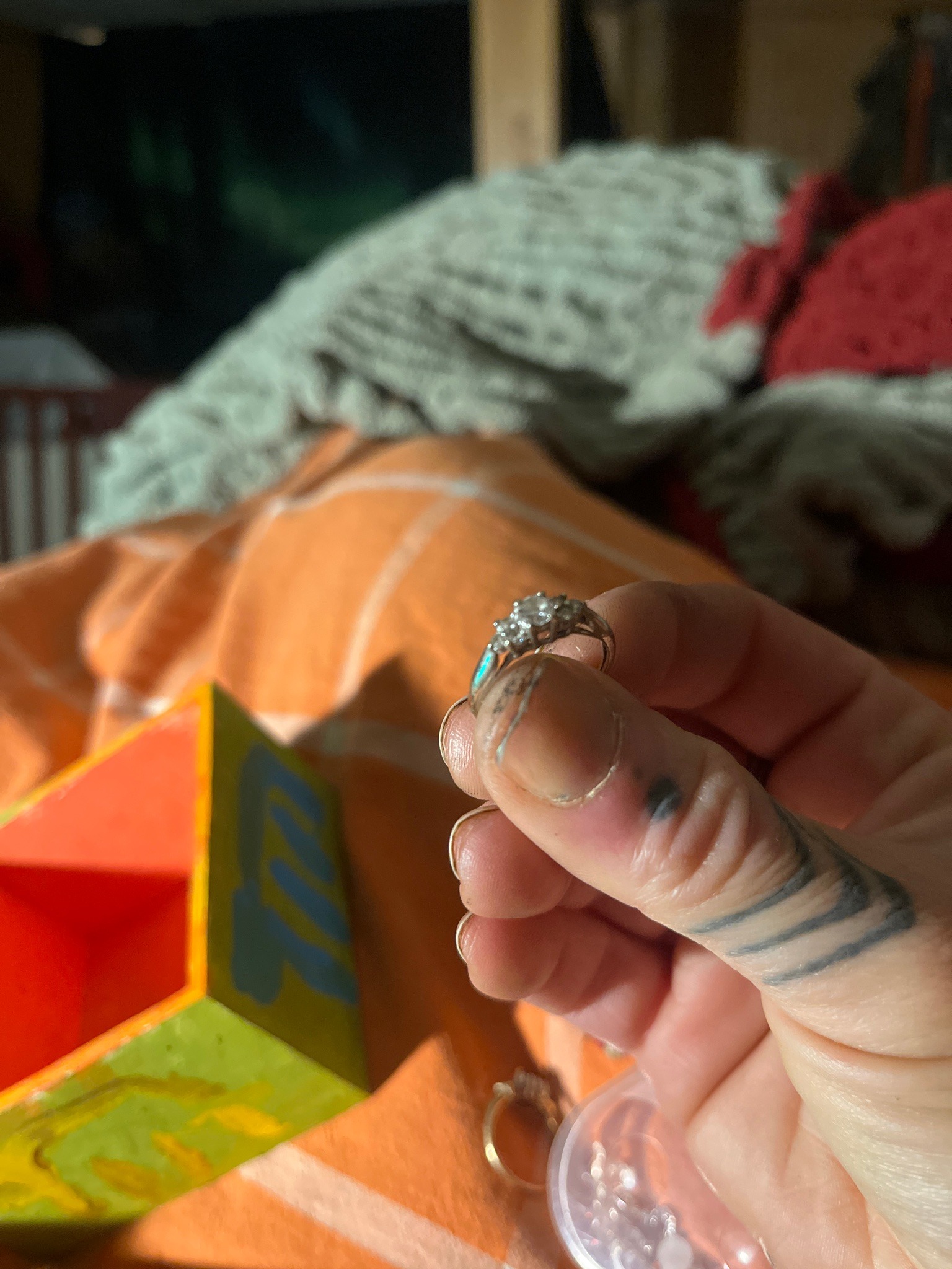 This is a delicate, multi-stone ring featuring a central cluster of round-cut diamonds or diamond-adjacent gemstones set in a bright white metal. The primary setting consists of a larger central stone flanked by smaller stones, creating a floral or scalloped silhouette. The gemstones are secured with multiple prongs, a style typical of mid-to-late 20th-century engagement or anniversary jewelry. The band is a slender, polished shank that appears to be made of 10k or 14k white gold, though platinum is a possibility depending on the weight and density. The metal shows minor surface abrasions and fine scratches consistent with regular wear, particularly along the lower portion of the shank. The craftsmanship indicates a commercial production piece of high quality rather than a custom artisan work, suggesting an age of approximately 20 to 40 years. There are no maker's marks visible in this orientation, but such marks would typically be located on the interior of the band. The stones possess a high degree of luster, reflecting light effectively even in a domestic setting, which may indicate genuine diamonds or high-grade cubic zirconia. The overall condition is good, with all stones appearing securely seated in their respective prongs.