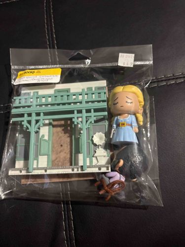 This item is a set of small-scale stylized figures and a building facade from the Funko Mystery Minis Westworld collection. The set includes a Dolores Abernathy figure wearing her iconic blue 'prairie' dress and holding a revolver, and a Dr. Robert Ford figure shown seated and tied to a chair, reflecting a specific scene from the HBO series. A significant component is the green and white plastic facade representing the Mariposa Saloon, featuring a porch, balcony, and a gramophone accessory. The items are constructed from molded PVC and plastic, typical of Funko products, with a matte finish. They are currently contained within a clear polyethylene resale bag with two stickers: a yellow Half Price Books label identifying the set and a white price tag of $4.99. Based on the 2017-2018 release period for this line, the items appear to be in good secondary-market condition with no visible breakage through the plastic, though slight paint transfer or scuffing may be present from being stored loosely together. The craftsmanship is consistent with mass-produced blind-box collectibles of the late 2010s.