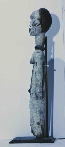 A vertical, hand-carved wooden sculpture depicting a stylized human figure, likely of mid-20th-century African origin or influenced by the aesthetic traditions of West African ethnic groups. The figure stands approximately 12 to 18 inches tall and is mounted on a modern metal display stand with a tiered wooden base. The sculpture features a prominent, ellipsoidal head with a darkened coiffure or cap area, an elongated neck adorned with a ringed collar, and a simplified torso with small, high breasts. The surface is heavily textured with a light, chalky pigment or kaolin clay finish, showing significant age-related patina. Distinguishing features include a series of raised, beaded markings or scarification running down the front of the abdomen and a pronounced navel. The arms are carved in low relief against the torso, ending in square-cut fingers. Visible condition issues include various surface cracks, wood checking, and significant erosional loss at the base of the wood where the feet would be located. There are no visible maker's marks or signatures, consistent with traditional ritual or community-based utilitarian art. The craftsmanship is characterized by bold, subtractive carving techniques and a geometric reduction of the human form, typical of mid-century ethnographic art.