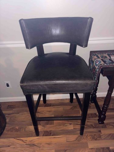 This item is a counter-height stool featuring a dark, possibly charcoal or espresso colored, upholstered seat and backrest, supported by a wooden frame of a matching dark hue. The upholstery appears to be a faux leather or a durable fabric, showing a slight sheen and some areas of gentle wear, indicating use. Specifically, there are lighter scuff marks or areas of fading on the top-right curve of the backrest, suggesting friction or age. The seat cushion is well-padded and rectangular with slightly rounded corners, exhibiting a visible stitched seam along its perimeter. The backrest is gently curved and tapers outward slightly at the top, attaching to the seat frame via two vertical wooden supports. The wooden legs are square-profiled, straight, and connected by sturdy stretchers on all four sides for added stability. The overall construction suggests a contemporary or transitional style, designed for durability and comfort in a kitchen island or bar setting. The wood finish is solid and opaque, obscuring any natural wood grain. No discernible maker's marks, signatures, or stamps are visible in the provided image. The stool appears to be in good used condition with expected signs of wear for a functional furniture piece, but no significant damage like tears or structural breaks are apparent. The craftsmanship appears to be commercial grade, suitable for everyday use.