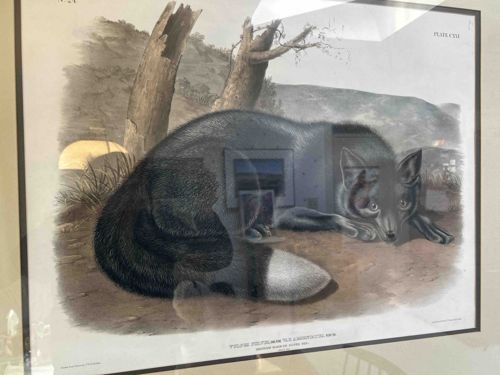 This item is a hand-colored lithograph from the mid-19th century, specifically Plate CXVI titled 'VULPES FULVUS, DESM. VAR. ARGENTATUS, SHAW. AMERICAN MARSH OR SILVER FOX' from John James Audubon’s 'The Viviparous Quadrupeds of North America.' The artwork depicts a black silver fox in a recumbent position amidst a rugged, hilly landscape featuring broken tree trunks and sparse vegetation. The printing process involves a combination of stone lithography and detailed hand-coloring, showing fine gradations of gray and black in the fox's fur, accented by a distinctive white-tipped tail. The upper right corner is marked 'PLATE CXVI.' The item is housed in a modern black frame behind glass. Noteworthy is the scientific nomenclature printed at the bottom center. Regarding condition, there appears to be slight yellowing of the paper consistent with age, though the colors remain largely vibrant. A significant reflection from the glass obscures parts of the central fox figure in the photograph. The craftsmanship reflects the high standards of the Bowen firm (J.T. Bowen, Philadelphia), known for producing the imperial folio and octavo editions of Audubon's mammals. This piece exhibits the signature naturalist style of the 1840s, emphasizing scientific accuracy combined with dramatic, artistic composition.